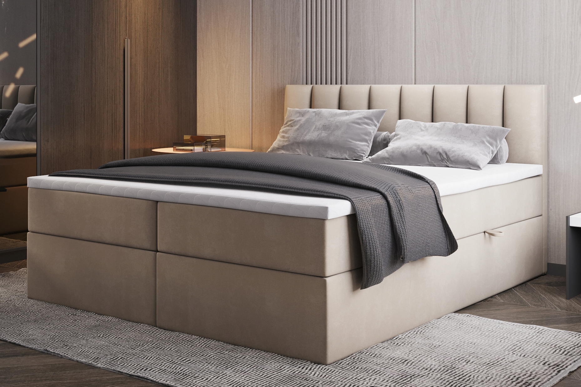 Beżowe łóżko kontynentalne Palermo 180x200Ponadczasowa forma z charakterystycznym tapicerowanym wezgłowiem. Pionowe przeszycia nadają elegancji, a wypełnienie wezgłowia zapewnia komfort w pozycji siedzącej.Certyfikowana tkanina Casablanca przyjemność dla wielu zmysłów. Radość dla oczu przy każdym spojrzeniu i miękka w dotyku w kontakcie ze skórą.2 duże pojemniki na pościel zapewniają maksymalne wykorzystanie przestrzeni nawet w kameralnych wnętrzach. Twoje tajemnice…