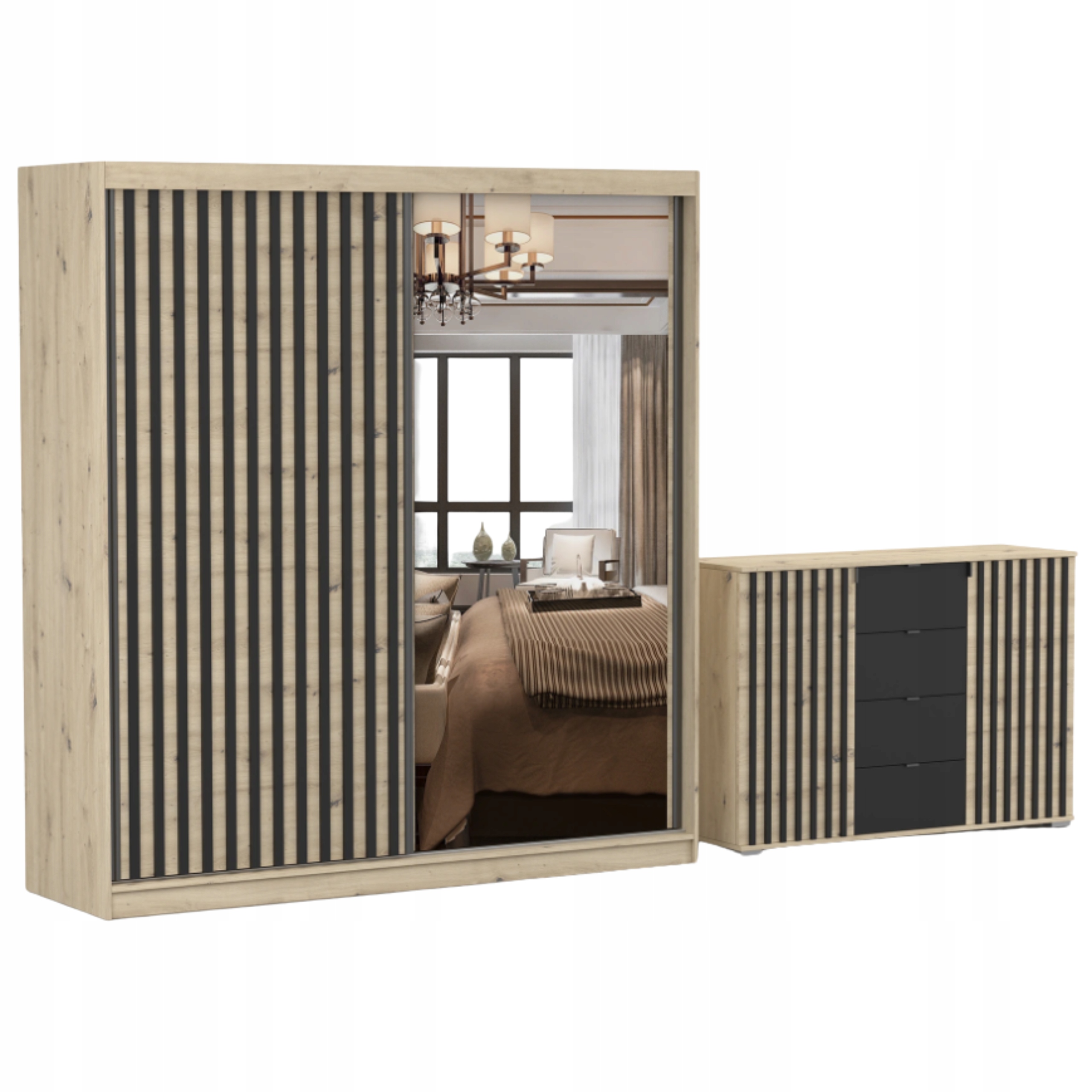 Zestaw WERONA L 2D łączy funkcjonalność z nowoczesnym, loftowym designem. Składa się z przesuwnej szafy z lustrem oraz dekoracyjnymi lamelami oraz pojemnej komody z szufladami i szafkami. Idealny komplet do sypialni, garderoby lub salonu.